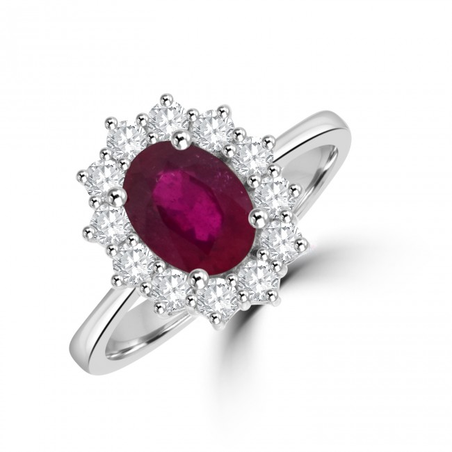 An oval cut, 1.70ct Ruby is the focal point to this traditional style cluster. The precious stone is African and has been chemically enhanced to improve aesthetics. Its blood red tones contrast effectively with the white brilliance of twelve surrounding, brilliant cut diamonds. The clawed setting is made in silky and luxurious white gold with a plain tapered shank.