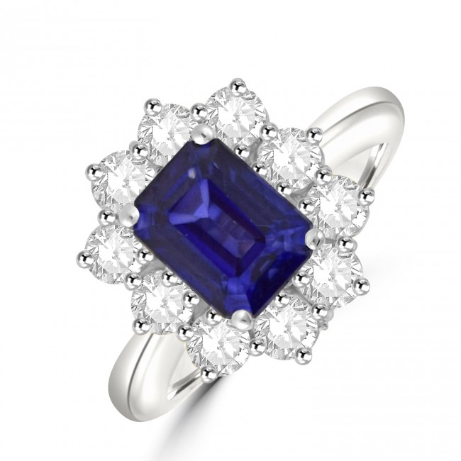 Platinum Sapphire and Diamond Emerald cut cluster ring