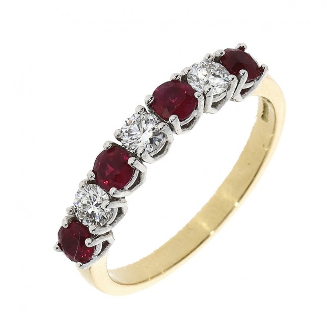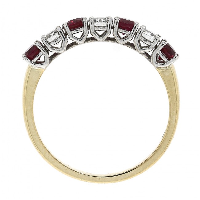 Four round cut red Rubies alternate with three brilliant white diamonds in a Platinum 4-claw setting with V-shaped collet and gallery bar. The mount is beautifully contoured within an 18ct yellow gold half shank.