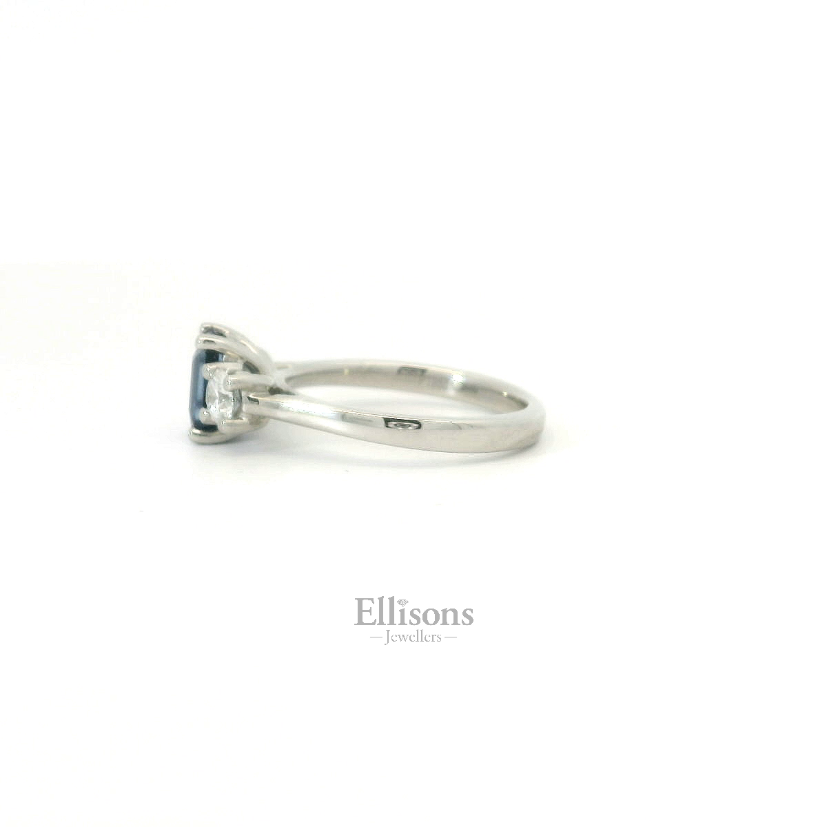 This beautiful, octagonal, emerald-cut Sapphire radiates deep royal blue tones with vibrant flashes. Mounted in Platinum, between the brilliance of white diamonds. The understated mount is underwired to allow for a perfect wedding ring fit. 1.22ct Emerald cut Blue Sapphire ~ Ceylon origin Enhanced by re-crystallised diffusion