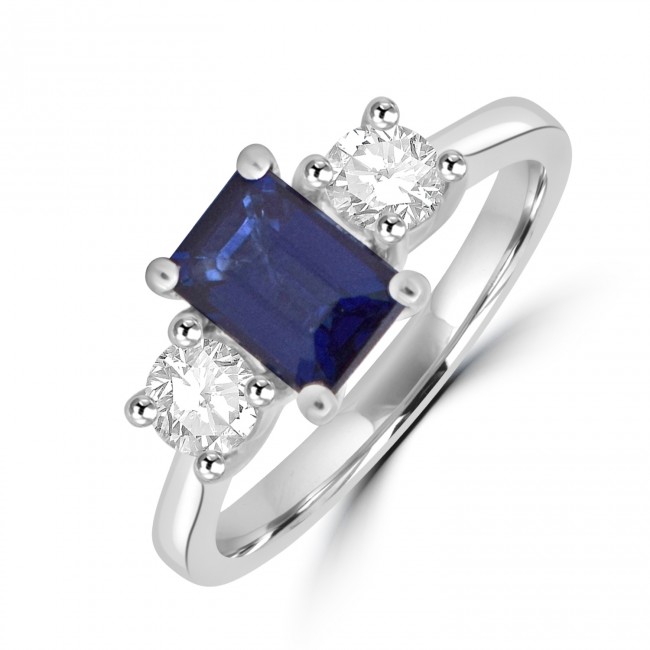 Platinum Emerald cut Sapphire and Diamond Trilogy ring