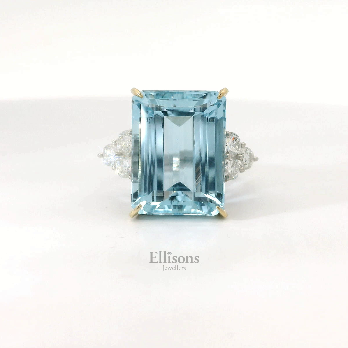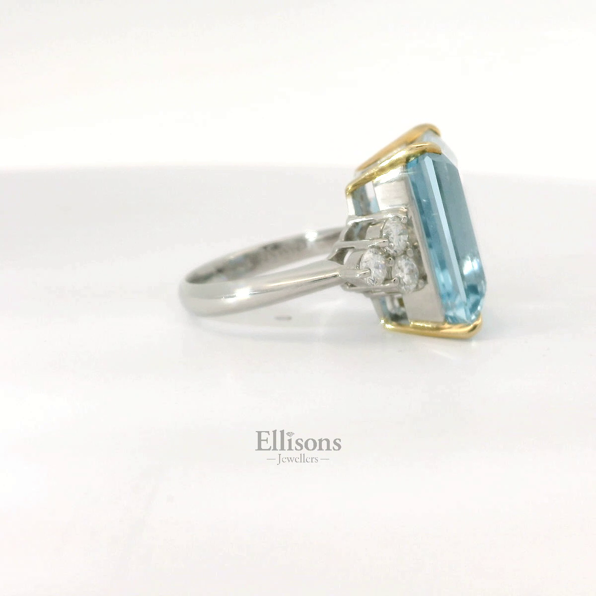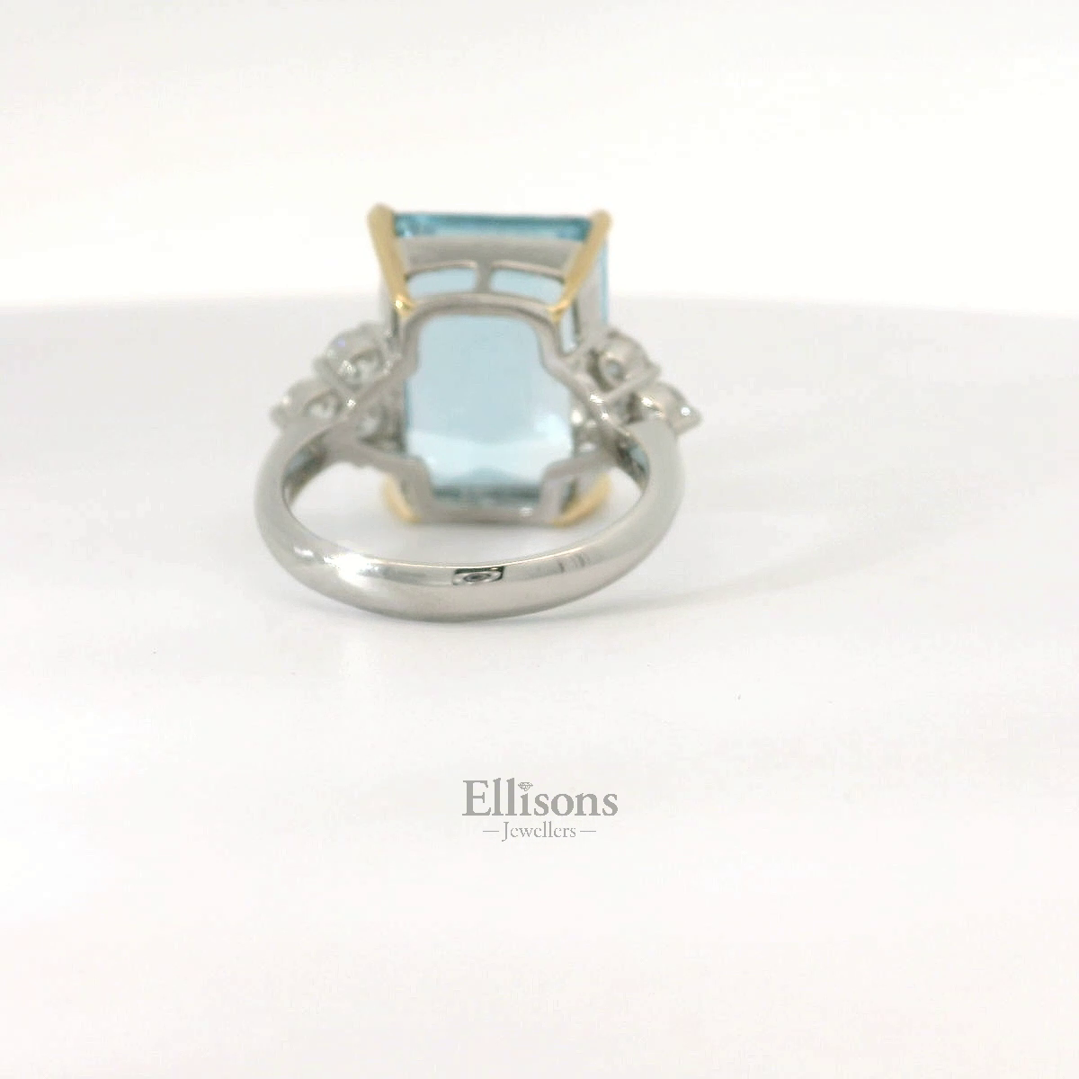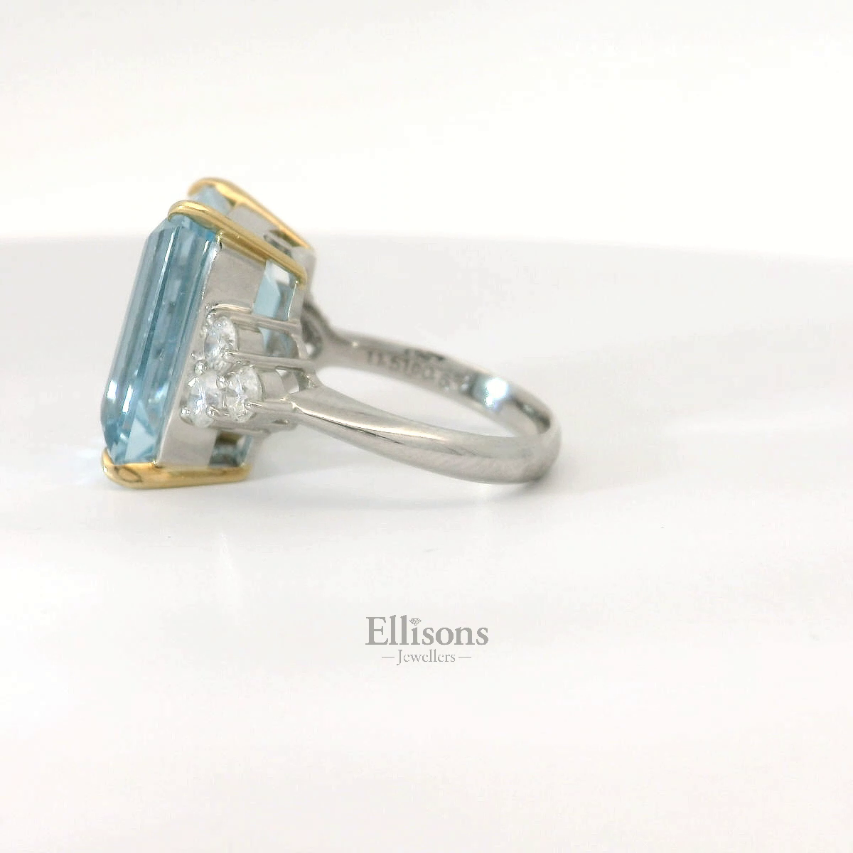 The refreshingly ice-blue tones from clear depths of this Aquamarine feel almost cool against the skin! Weighing 11.51ct, the impressive size exhibits stunning symmetry and colour. Mounted in the warm tones of 18ct yellow gold and contrasting with a white diamond 'trefoil' either side. The band is crafted in platinum. This ring need to be seen to be fully appreciated.
