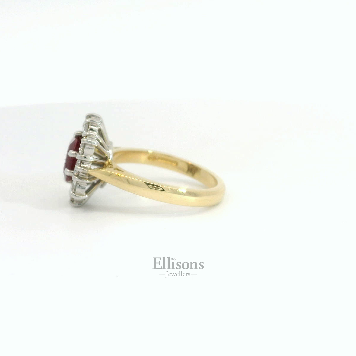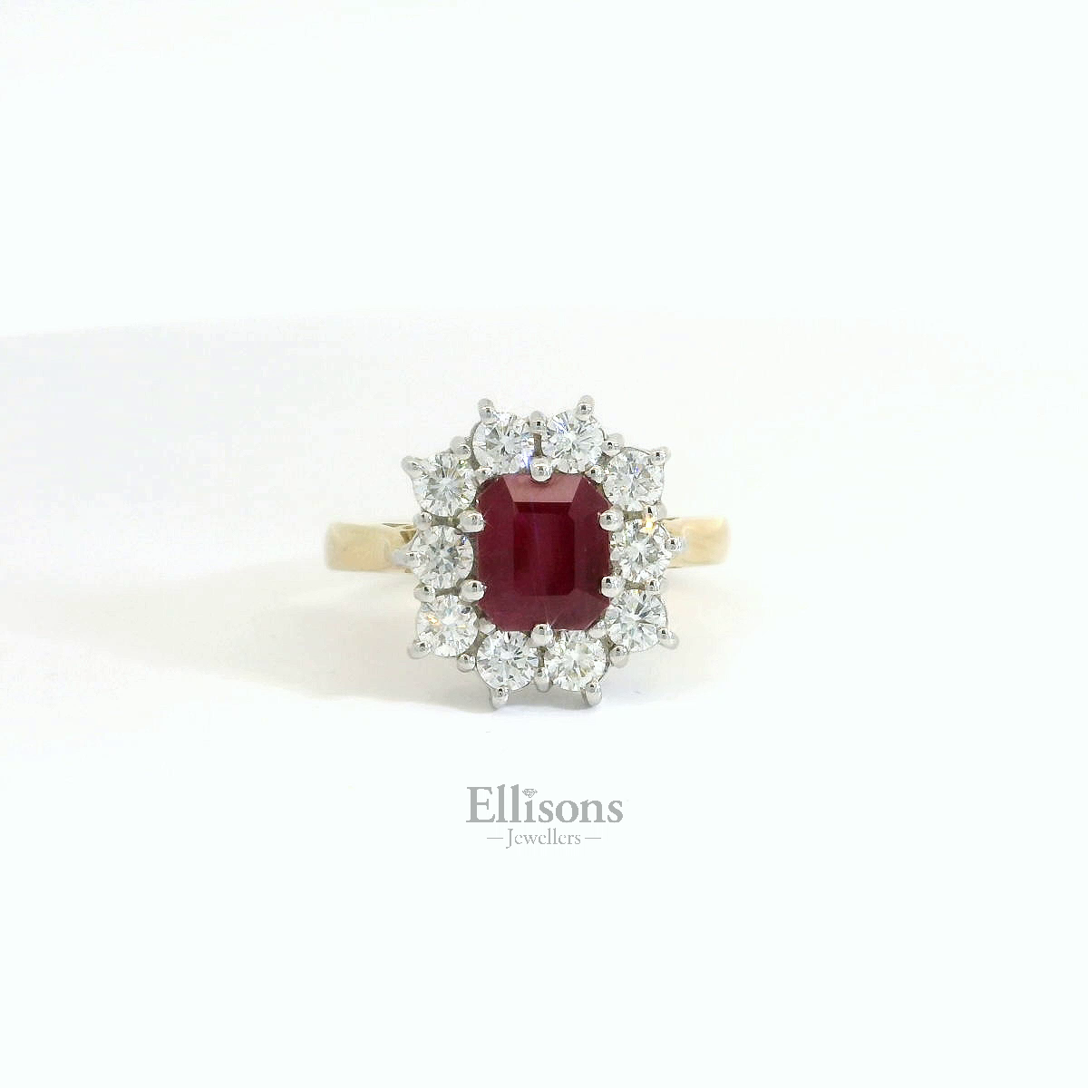 A classic, timeless design featuring an obvious, fine quality. An octagonal, emerald cut Ruby radiates deep, scarlet red tones in centre focus. Ten brilliant cut diamonds scintillate in surround. The white clawed setting is positioned on an 18ct yellow gold shank.