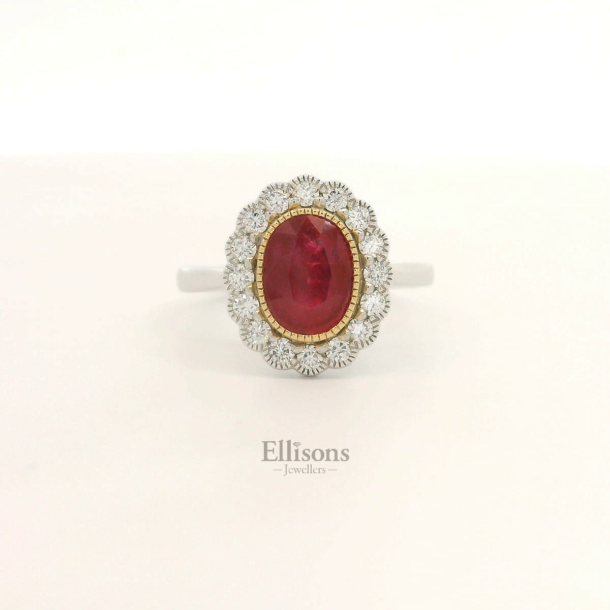 Platinum 18ct Gold Ruby and Diamond Oval Vintage Cluster