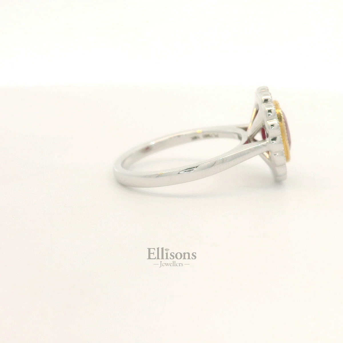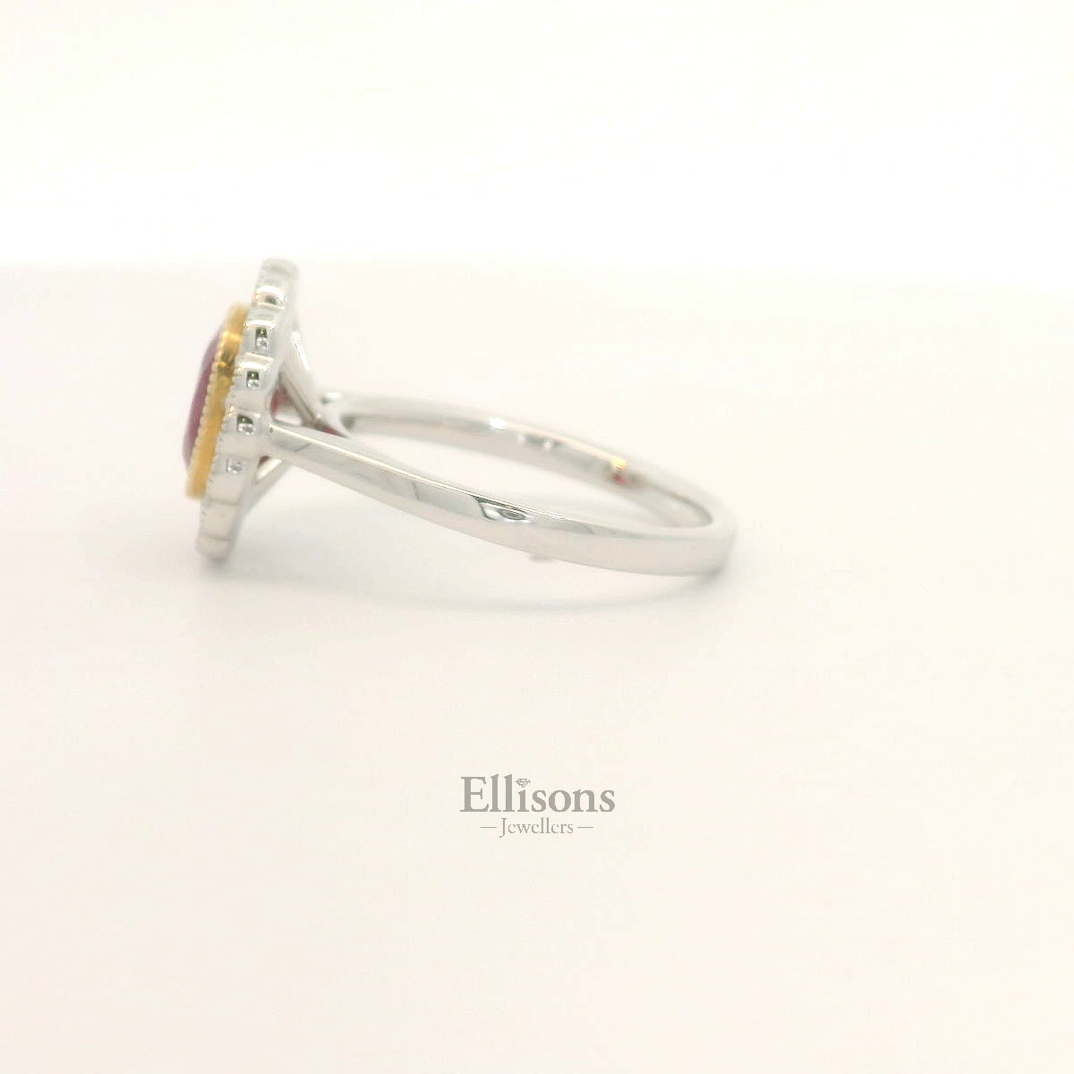 Mysterious endearing scarlet red tones, radiate from this beautiful ruby, set flush within a millegrain beaded edge, crafted in the warm hue of 18ct yellow gold. Sixteen brilliant cut diamonds surround and are set in a similar rubover setting, helping to create a flower-like, scalloped outline. Reminiscent of a vintage style era, the design subtly modernised by allowing for a perfect wedding ring fit.