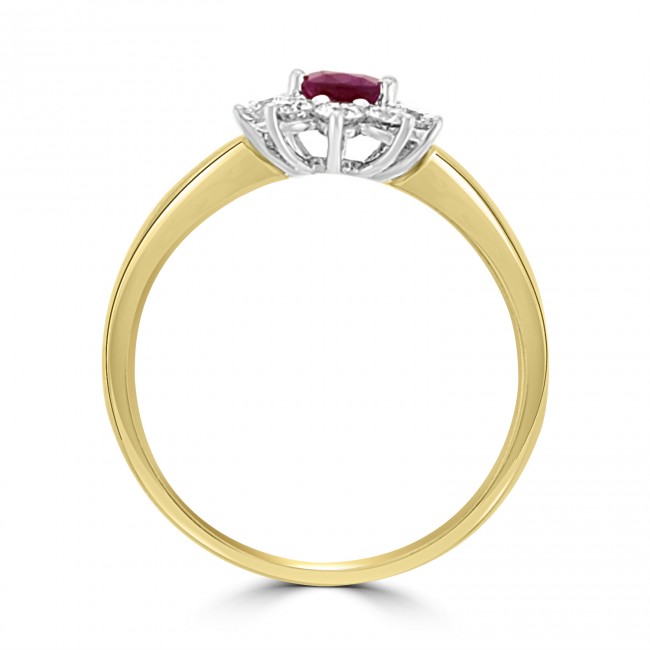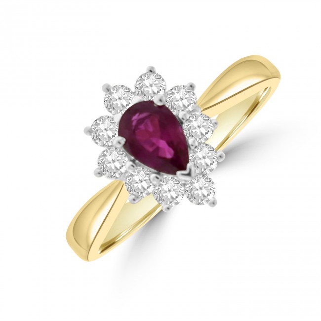 Simple and beautifully designed traditional style cluster with a pear cut Ruby in centre focus amidst the striking outline of ten, brilliant cut white diamonds. All set in silky white gold on a yellow gold shank.