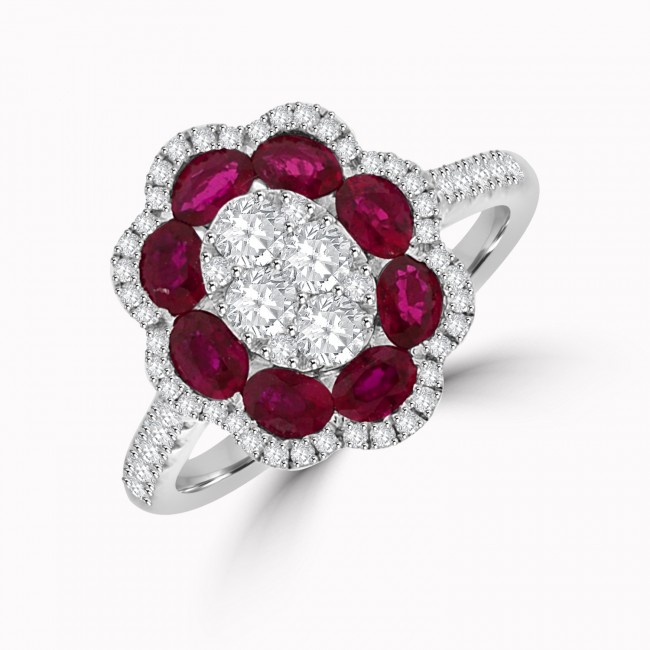 Eight oval cut and scarlet red Rubies are displayed around a central illusion-cluster of dazzling diamond. The oval, shaped cluster is outlined by fine grain set diamond that continue down the silky white gold shoulders of a hugely impressive Ruby & Diamond ring.