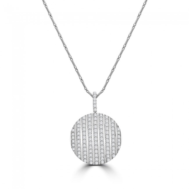This exceptionally well made pendant disc is fully formed with a rounded front and back surface, made in silky luxurious 18ct White Gold. Series of Diamonds are set within smooth bars running vertically across the full front surface of the pendant. The spectacle is fit with a matching diamond set bale. Featuring over a full carat in fine white Diamond, the results are dazzling. Sale price refers to pendant only; chain sold separately. For reference, chain shown measures 18" in 9ct White Gold. Sale price £125 Code: 5507628