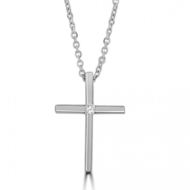 Plain, yet beautifully effective, this deep, solid cross features an inset diamond in central focus. The chain can be fixed at 16 or 17 inches.