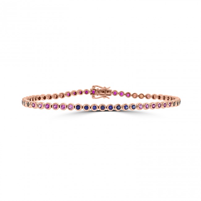 A unique and beautifully designed tennis style bracelet, made with smooth rubover settings in 18ct rose gold. A series of brilliant cuts feature 1.20ct mulit-coloured Sapphire, .38ct red Ruby and .34ct white Diamond, meaning over 1.90ct in natural and precious gemstones.