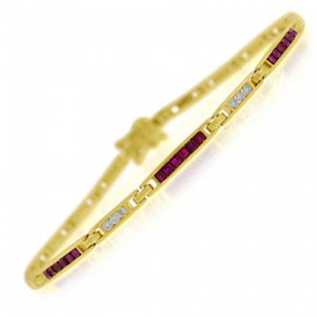 Princess cut Ruby set sections are altered with channel set Diamond sections in this warm and majestic, yellow gold bracelet.