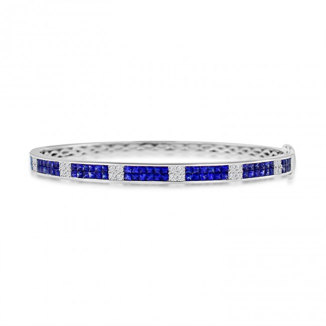 An absolutely stunning bangle, impressively made in 18ct white gold and hinged with safety catches. Seven sections of two rows of princess cut Sapphires create a uniform electic blue glow. This contrasts effectively with the white brilliance of insersecting micro claw set "quads" of diamond.