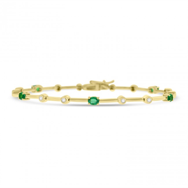 Solid, rod-shaped bars, made in warm and majestic yellow gold create the sequence and elegant design of this stunning bracelet. Claw set, oval cut Emerald alternate with two rub-over set diamonds in succession throughout its length. The five Emeralds that feature are Brasilian in origin. They have undergone a synthetic process known as re-crystallisation to enhance their clarity. The chemical properties of the Emerald remain unchanged and the process is permanent.