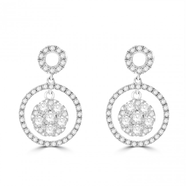 Beautifully designed drop earrings, made in 18ct white gold and featuring a total .78ct Diamond. A micro claw set round cluster dazzles in centre focus, hanging freely within a surrounding "halo" of diamond brilliance. The stem and butterfly back is fitted to an open circle of diamond stud.