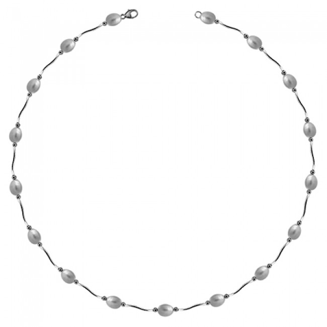 A beautifully elegant necklet, alternating rice-shaped white freshwater pearls with wave-shaped silver rods. The stock item measures 17" in length; alternative lengths can be made to order.