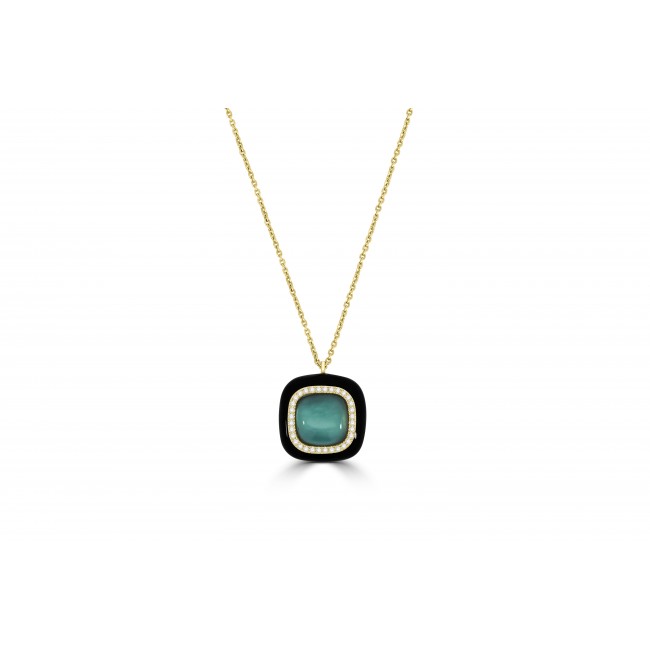 A stunning combination of soft, luxurious colour tones and refined design is represented with this stunning pendant, made in Italy. In centre focus, a cabochon green agate is cushion shaped and positioned over a mother of pearl base, offering a soft glow and undertone. Bordered by a pave set surround of white diamond and on the base of rounded black ceramic. Unique and beautiful, with earrings and ring available to match.