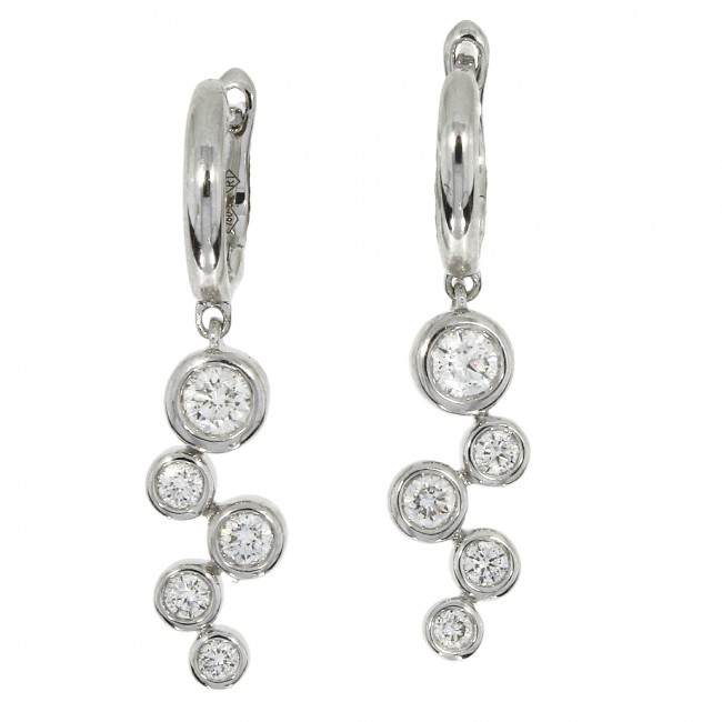 Five brilliant cuts of various sizes are rub-over set in a staggered, scatterset drop that hangs from a fine, hinged hoop. Made in silky 18ct white gold and radiant with fine diamond.