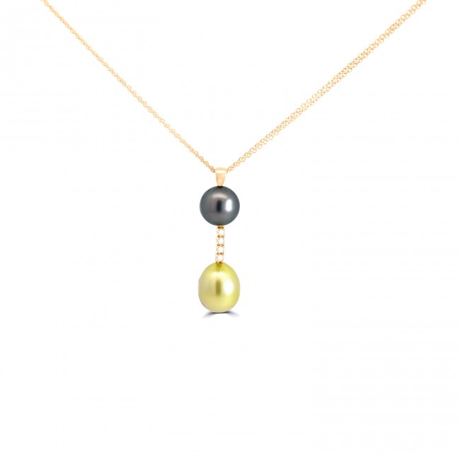 A unique and beautifully designed pendant consisting of a round Tahitian pearl, from which a solid diamond section leads to a larger South Sea pearl, radiant with gold tones. The stunning pendant is fived within an 18" fine trace chain.