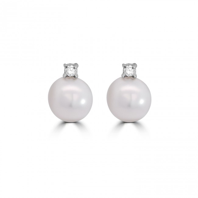 A round brilliant cut diamond is set in a 4-claw solitaire stud, made in 18ct white gold. Fixed atop a round, white freshwater pearl.
