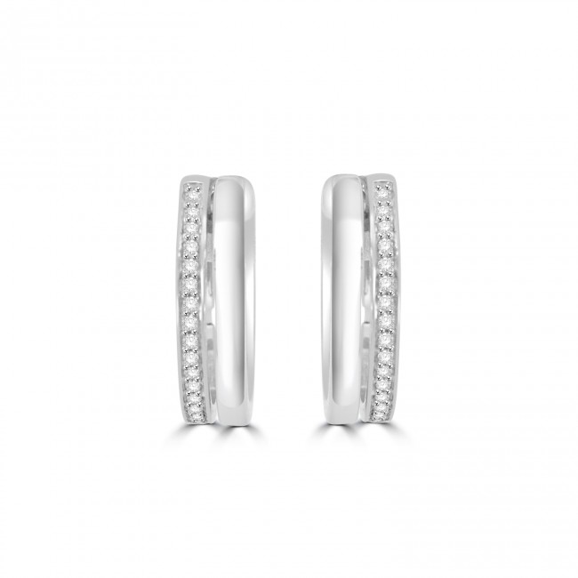 Impressively well made in solid and silky 9ct white gold. The hoops are split with a pave set diamond bar contrasting with a plain section. The back of the hinged hoop is olid and completes an overal diameter of 15.5mm.