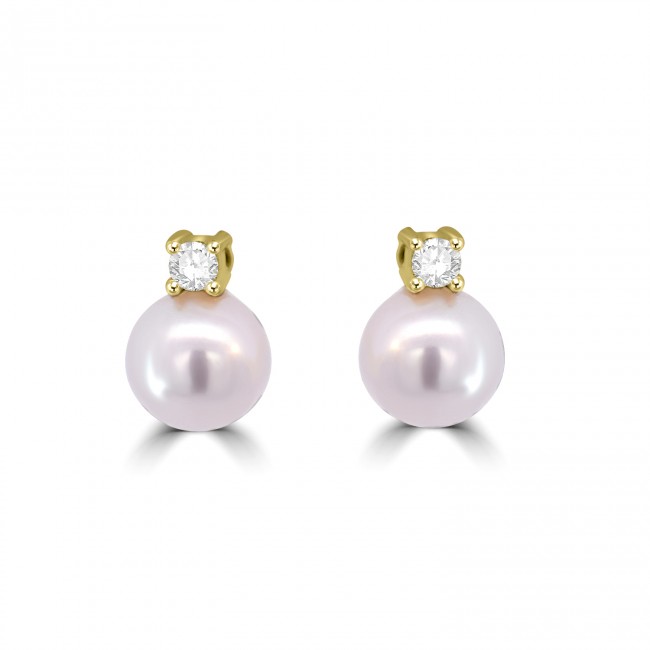 A .05ct Brilliant cut is claw set in a yellow gold setting. The stud is fixed to a white, freshwater cultured pearl; perfectly rounded and measuring 6.5mm approx. in diameter.