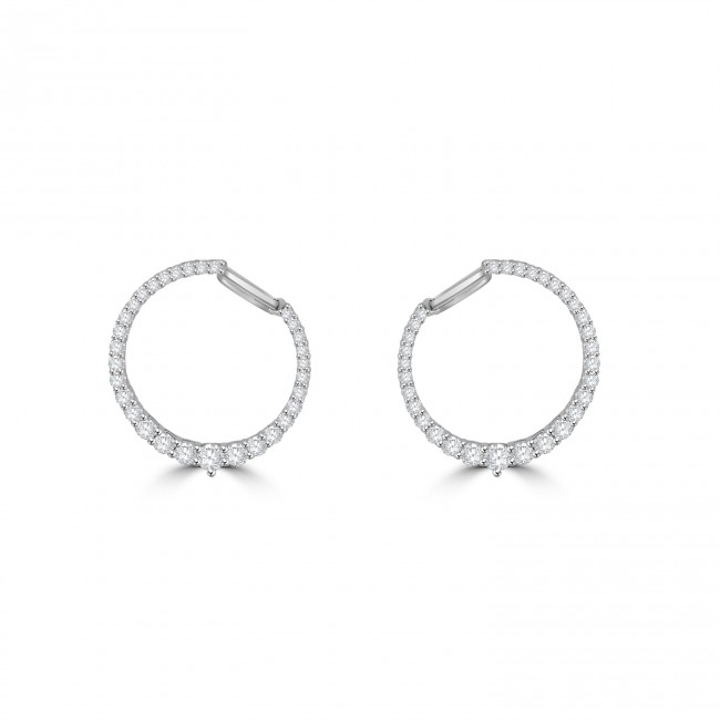 Exquisite, Italian design, expertly crafted in 18ct white gold, this unique earrings radiate effortless beauty and refined elegance. An open circle of claw set Diamond graduates to a larger centre stone, offering a focal point in a spiral that subtely descends below the ear lobe. This creates an effective illusion that the diamond circle is continuous. The earrings are fitted by stem and an impressive manufactured hinge mechanism.