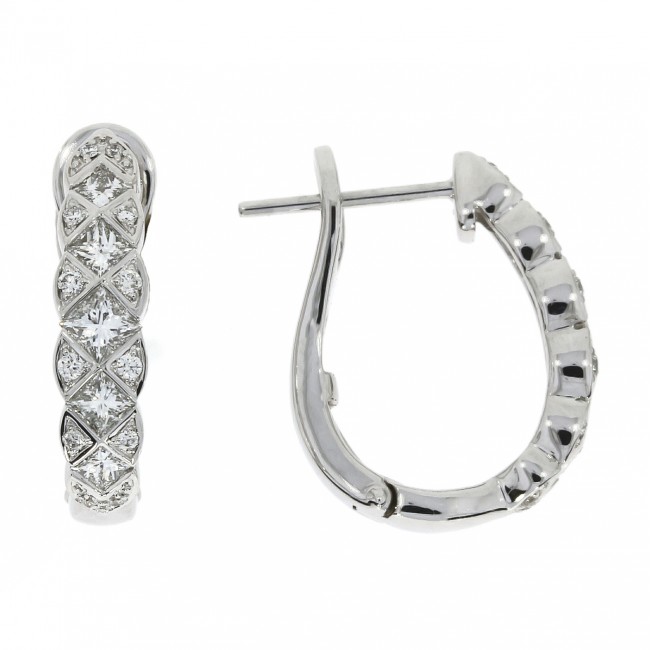 Five, graduated princess cuts are set flush is silky white gold, with micro claw set brilliant cut diamonds positioned either side and softening the outline by creating a ripple, scalloped edge. The hoops are hinged with a pincer style back, expertly crafted in 18ct white gold.