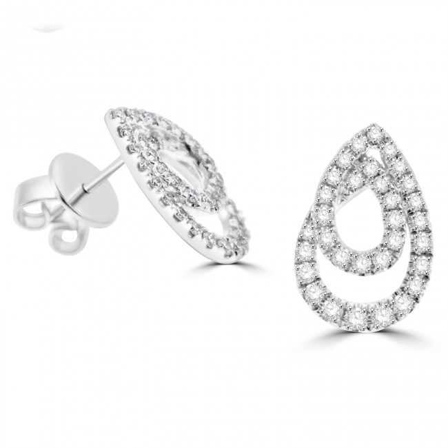 A pave set strand of silky white gold is beautifully shaped into a small and large overlapping pear shaped outline, inset with white diamond brilliance. The studs are fitted by stem and butterfly back.