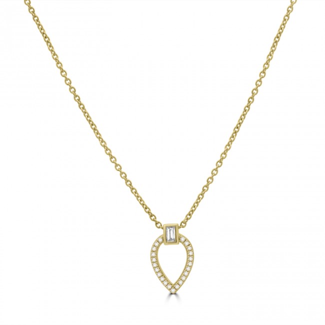 This strikingly beautiful pendant features a baguette cut diamond, set flush in a smooth rubover setting within an open pear shape bedazzled in pave diamond. The pendant is fitted within a 16" trace chain, crafted in the warm tones of 9ct yellow gold.
