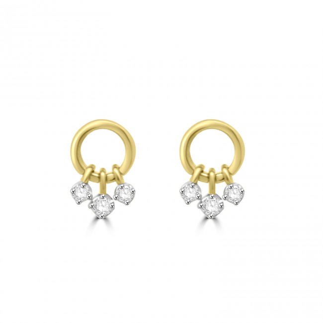 Warm tones radiate from an open circle shaped stud, featuring three brilliant cut diamond drops. The stud earrings are fitted by stem and butterfly backs.