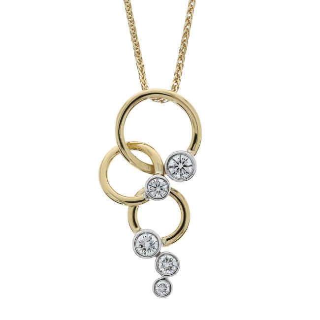 A stunning and unique design comprising of five Brilliant cuts of various sizes, set flush in white gold rubover settings. These settings are scatterset around three interlinking circles, fashioned in the warm tones of 18ct yellow gold. The pendant is fitted on an 18" spiga chain.