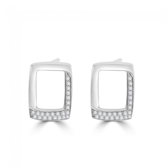 An open rectangular shaped stud with pave diamond illluminated two sides and contrasting effectively with the silky smooth surfaces of 18ct white gold. Fitted with stem and butterfly back.