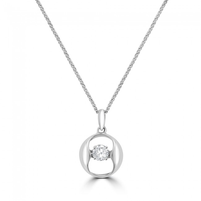 A .10ct Brilliant cut Diamond is claw set subtely on a white gold filament. This is fixed loosely to encourage movement and entice the Diamond brilliance to flicker. Eye catching and radiant with 18ct White Gold, the pendant is fixed on a 16" spiga chain.