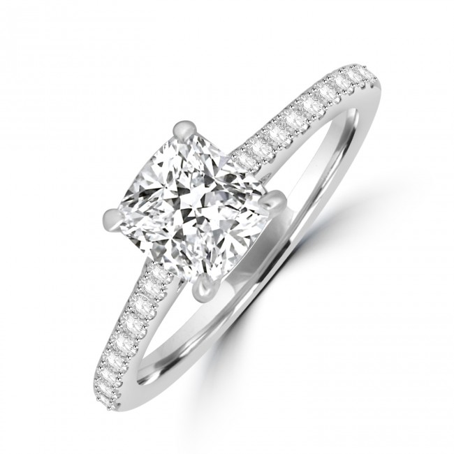 This handpicked Cushion cut Diamond is square shaped, with soft, rounded corners. Weighing an impressive 1.20ct and certified by GIA:- E colour ~ VS2 clarity ~ Excellent Polish/Symmetry ~ No Fluorescence Mounted in 4-claw setting and underwired for a perfect wedding ring fit. The platinum shoulders are castle set with round brilliant cut diamonds to compliment the white brilliance.