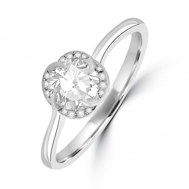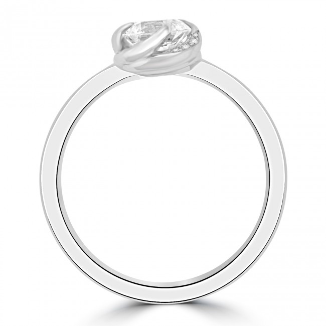 A .70ct Brilliant cut, carefully handpicked for its desirable aesthetics and value is accompanied with certification by GIA (D colour, I1 clarity, Excellent: Cut/Polish/Symmetry, Fluorescence None). The handmade setting flatters an already impressive Diamond even further. The four claws are, in effect swirled around the centre stone and the exposed surfaces are inset with pave set diamond. made in silky and luxurious platinum.