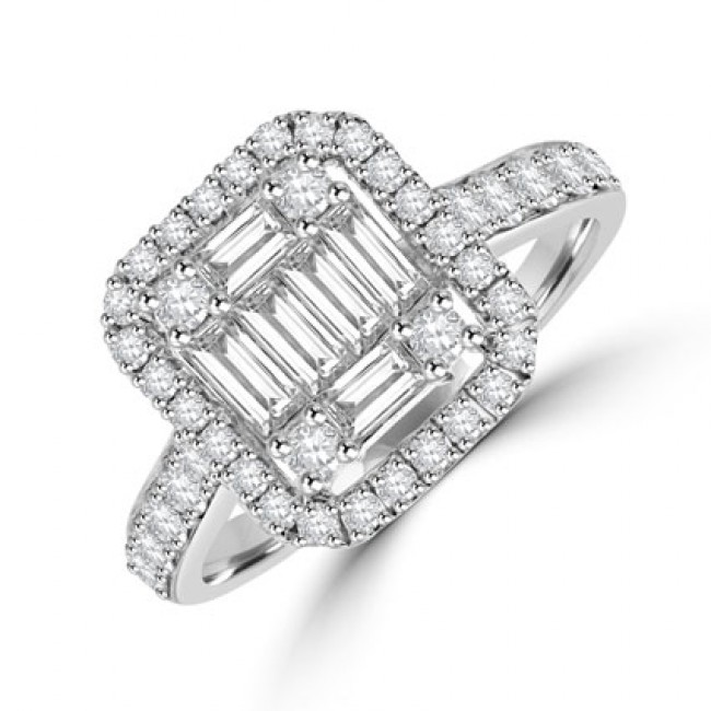 18ct White Gold Baguette Diamond Cluster Halo Ring