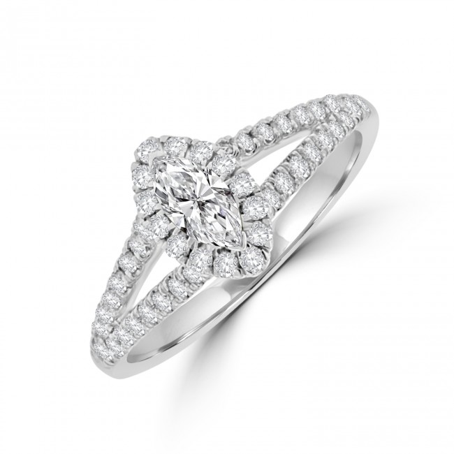 A nicely proportioned Marquise cut Diamond is flattered within a diamond surround and spit shoulders.