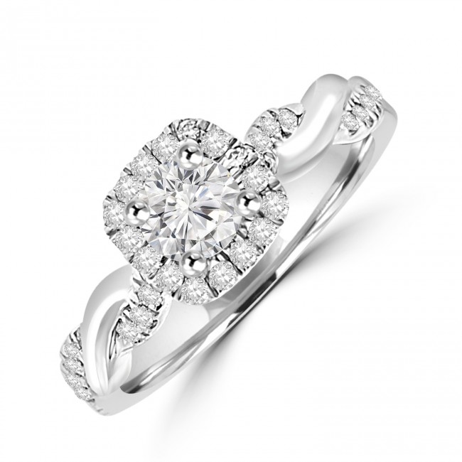 A brilliant cut is claw set above a cushion shaped surround of claw set diamond. The platinum mount is "perfect wedding ring fit" and the shoulders feature a two strand twist; one of which is inset with diamond.