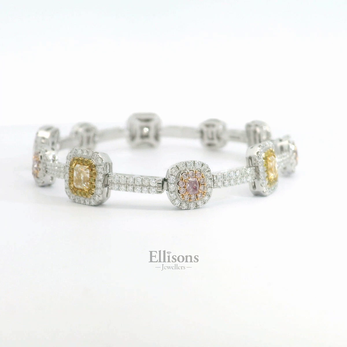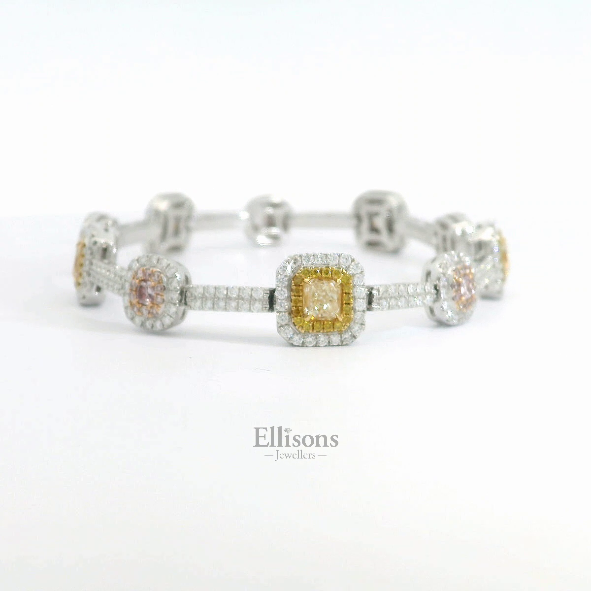 This one of a kind diamond bracelet radiates beauty in detail with rare and fancy colour tones. The theme alternates between natural Pink and Yellow Diamond sections. Five Cushion cuts of each colour is outlined by a 'halo' surround to complement and intensify with dazzling impact. Contrasting white diamond is micro claw set in surround and in two rows along the sequence of the bracelet. The impressive breakdown is as follows:- 5 x Cushion cut Fancy Yellow Diamond: 2.46ct ~ Pave surround: .45ct ~ Total: 2.91ct in Yellow Diamond 5 x Cushion cut Vivid Pink Diamond: .46ct ~ Pave surround: .33ct ~ Total: .79ct in Pink Diamond Micro claw set surrounds and two-row bars: 2.28ct White Diamond Total: 5.98ct Diamond ~ Natural, mined