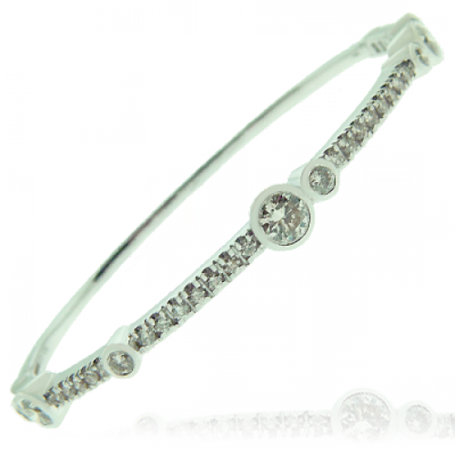 The traditional claw set bangle is modernised and flattered by larger rub-over set Diamonds positoned at intervals. The silky smooth white gold settings are the perfect backround to fine diamond fire and brilliance!