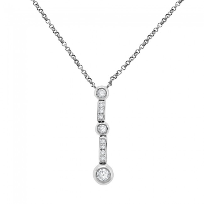A stunning dropper pendant, comprised of three rubover diamonds and two rod-like sections, inset with diamond. The overall spectacle measures 20mm approx in length and is fitted on a 16" chain, all made in silky and luxurious, 9ct white gold.