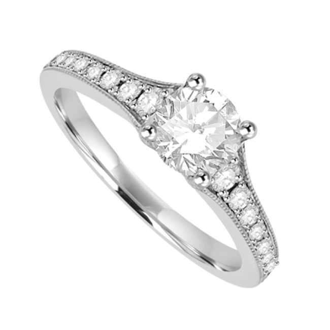 This quality certified centre diamonds is complimented by a tapering channel of grain set Diamonds in the shoulders of the band. The handpicked, .52ct Brilliant cut centre has been independently certified by IGI laboratories.