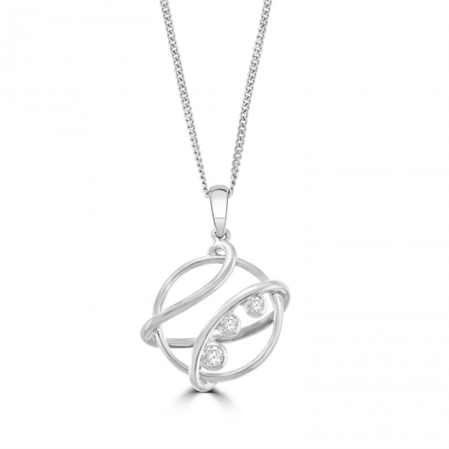 A beautifully designed pendant featuring a circle of life within an abstract twist, containing three rubover set, white cubic zirconia. The fine curb chain measures 18" with a ring for shortening at 16" length.