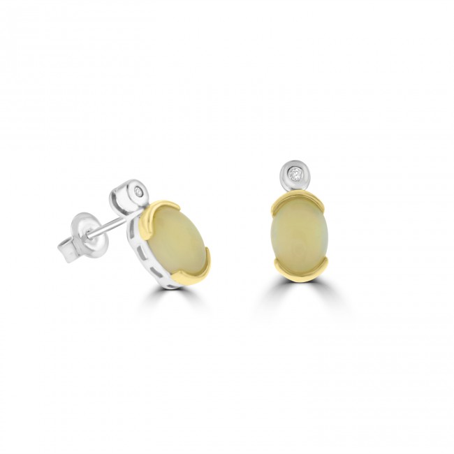 Oval shaped and white Opals are positioned within the warm tones of a yellow rub-over style settings. A white cubic zirconia contrasts effectively atop and the sterling silver earrings are fitted by stem and butterfly back.