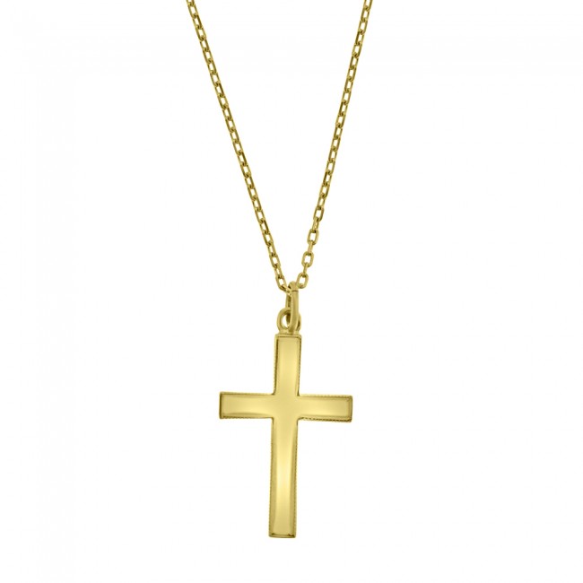 A high polished cross with a diamond cut, millegrain effect edge and plain bale. The pendant measures 25 x 16 x 2mm approx. Please Note: Sale price refers to Pendant only: Chain is sold separately. For reference, belcher chain shown measures 18" in 9ct yellow gold and sells for £85 approx. Code: 5507545