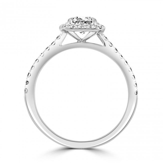 This carefully sourced .56ct Brilliant cut diamond was chosen for its stunning aesthetics and is accompanied with GIA Certification (F Colour, Si1 Clarity, Excellent Cut, Excellent Polish, Excellent Symmetry). Set within a cushion shaped (square with rounded corners), castle set diamond halo with matching shoulders. Made in luxurious Platinum.