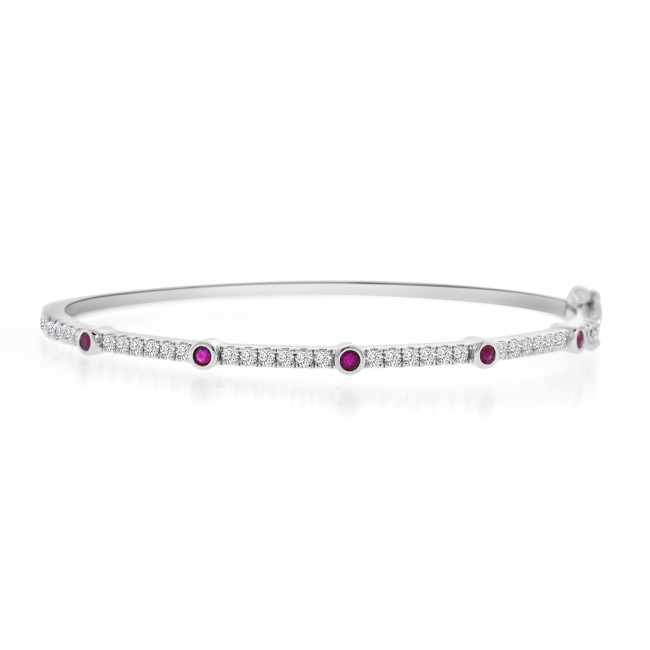 This elegantly designed bangle is hinged and inset with five natural Rubies and white Cubic Zirconia.