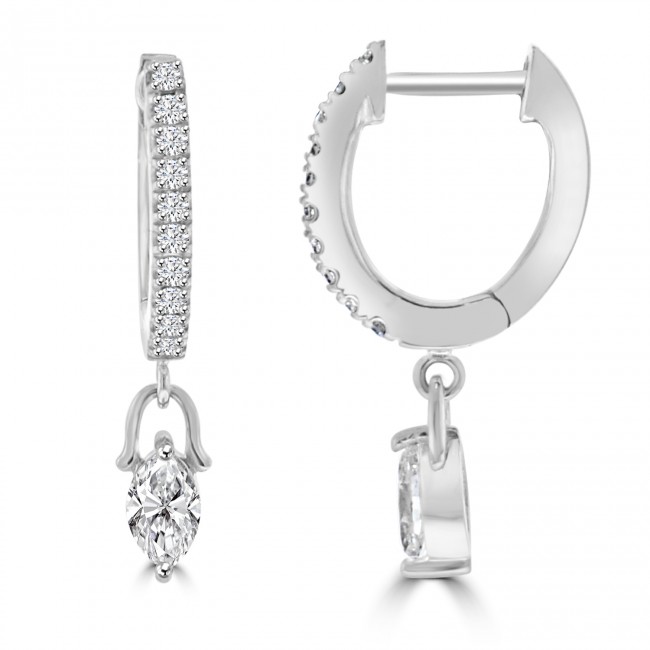 Beautifully elegant and striking, these huggy style, hinged hoops are inset with caste set diamond. A drop extends from the bottom of the hoop, featuring a .14ct Marquise cut Diamond that moves freely to reveal its dazzling fire and brilliance. Made in silky and luxurious, 18ct white gold.