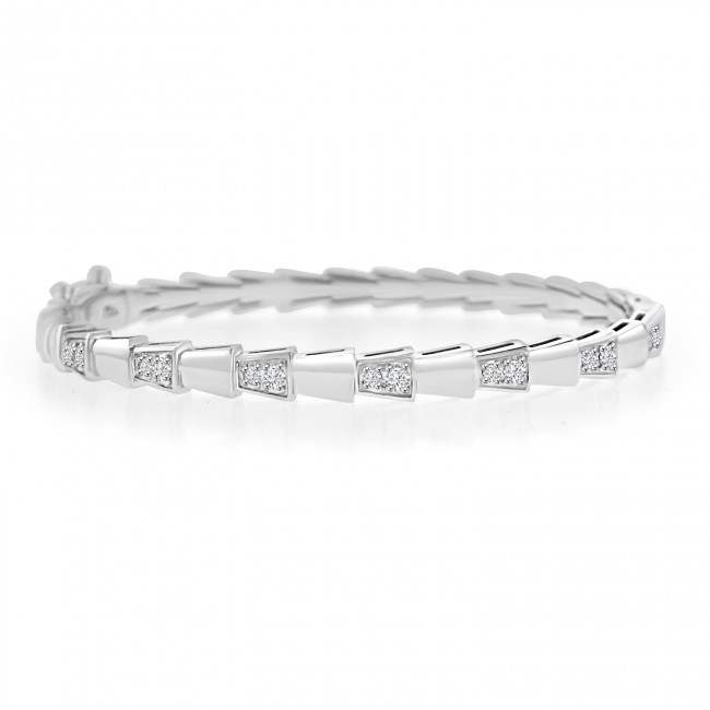 This beautifully designed bangle is impressively solid with a hinged mechanism and safety clasps. Tapered, wedge-like sections alternate between smooth, high polished surfaces and pave set diamond.