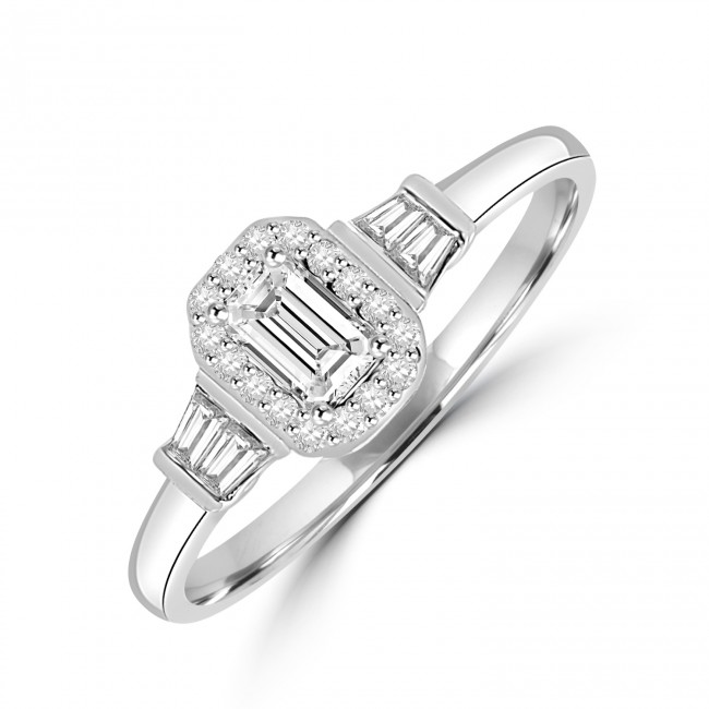 This beautiful design contrasts strikingly clear Baguette diamond in centre focus within a dazzling diamond halo. The Platinum shoulders taper with a pair of tapered baguette diamonds inset.